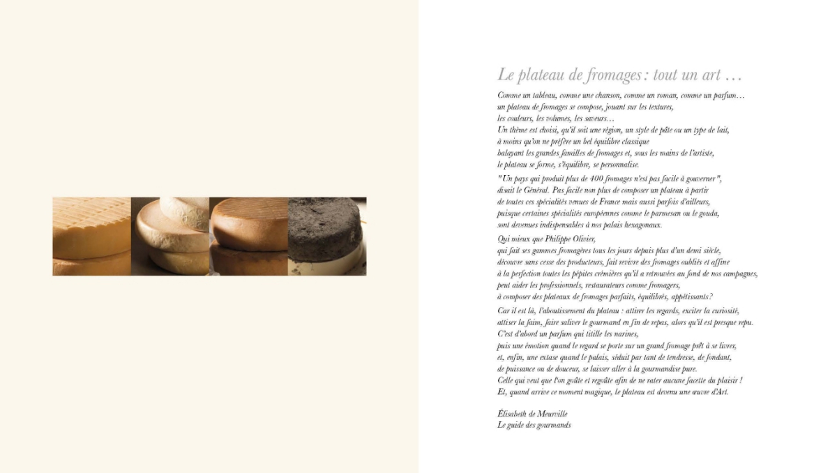 Aux élèves des lycées hôteliers, à leurs professeurs, aux clubs de restaurateurs, aux associations des métiers de bouche, aux organisations professionnelles des métiers alimentaires, aux traiteurs, à mes amis crémiers-fromagers détaillants, ce livre vous propose près de 50 exemples de plateaux, prêts à servir, d’hier et d’aujourd’hui, pour les bonnes tables en France et à l’étranger.